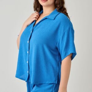Stay cool and stylish with this plus size 2-piece linen airflow button-down set, designed for effortless comfort and versatility. The collared, loose-fit dolman sleeve shirt features a V-neck front accented with ivory natural buttons for a relaxed yet polished look. Paired with elastic waist shirred shorts and a center-tacked front spaghetti tie, this set offers a flattering and comfortable fit. Crafted from lightweight, breathable fabric, it’s perfect for warm-weather days, travel, or casual outings. Easy to style together or mix and match with your favorite separates.