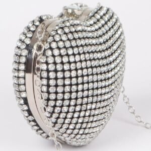 Make a glamorous entrance with the Rhinestone Heart Shape Party Clutch. Covered in radiant rhinestones, this heart-shaped design adds sparkle and sophistication to your evening look. Its compact size holds essentials while its shimmering finish ensures you’ll stand out at any event.