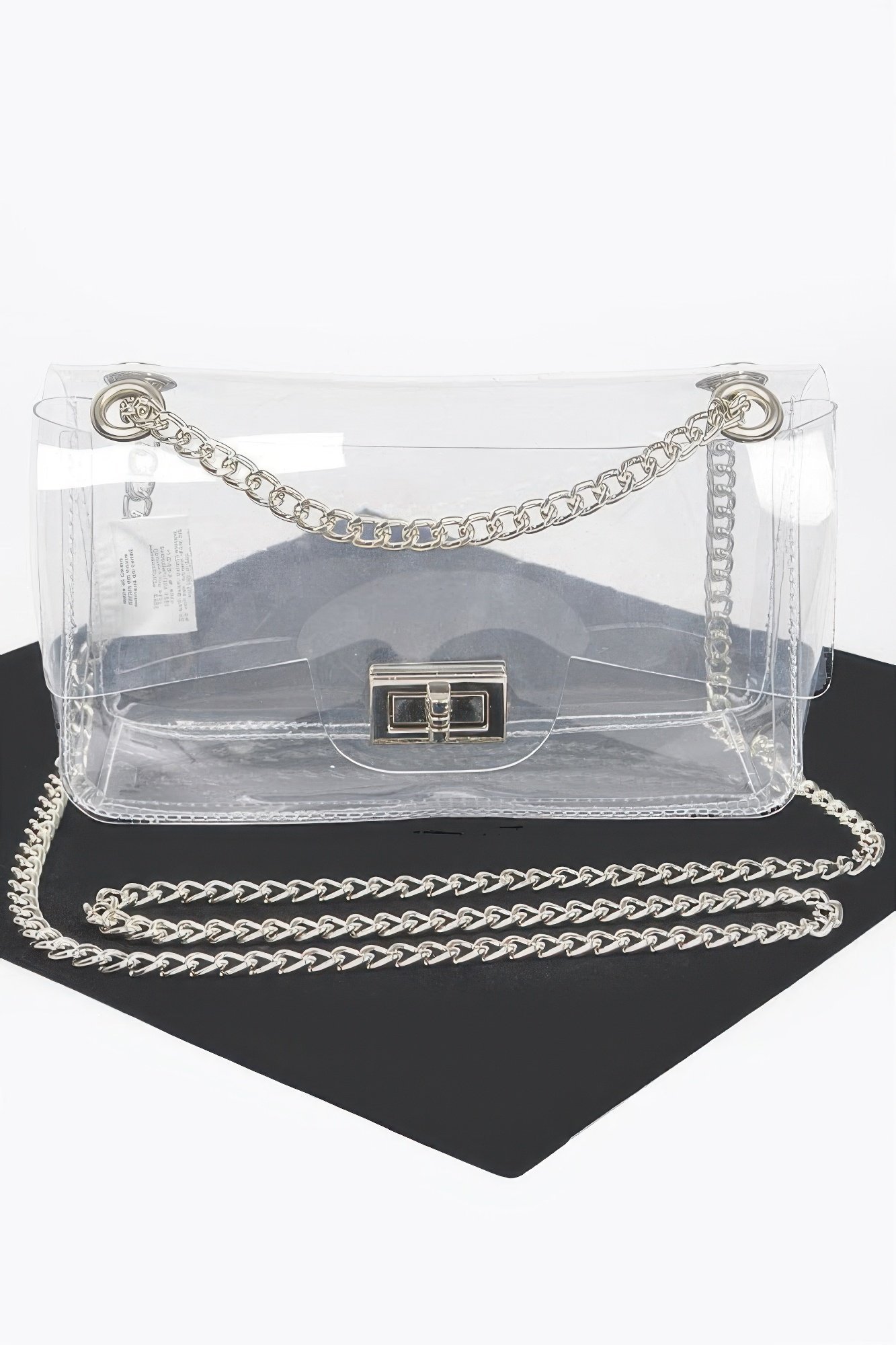 Design: Transparent body with a stylish flap closure, complemented by a sleek crossbody strap for comfort